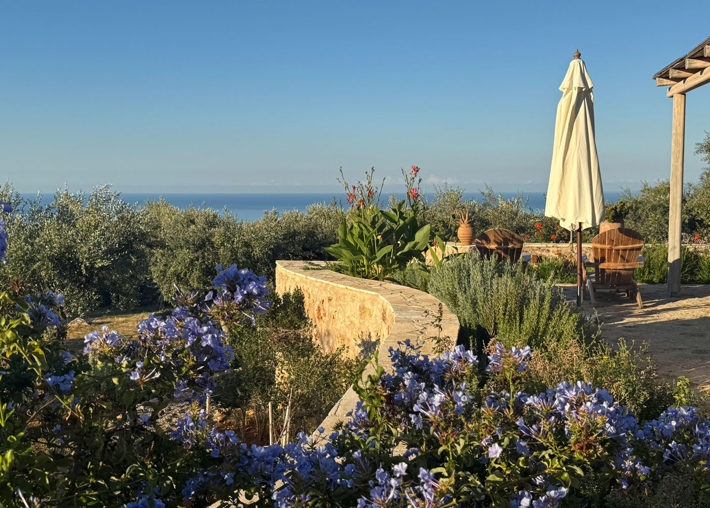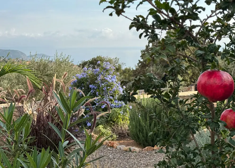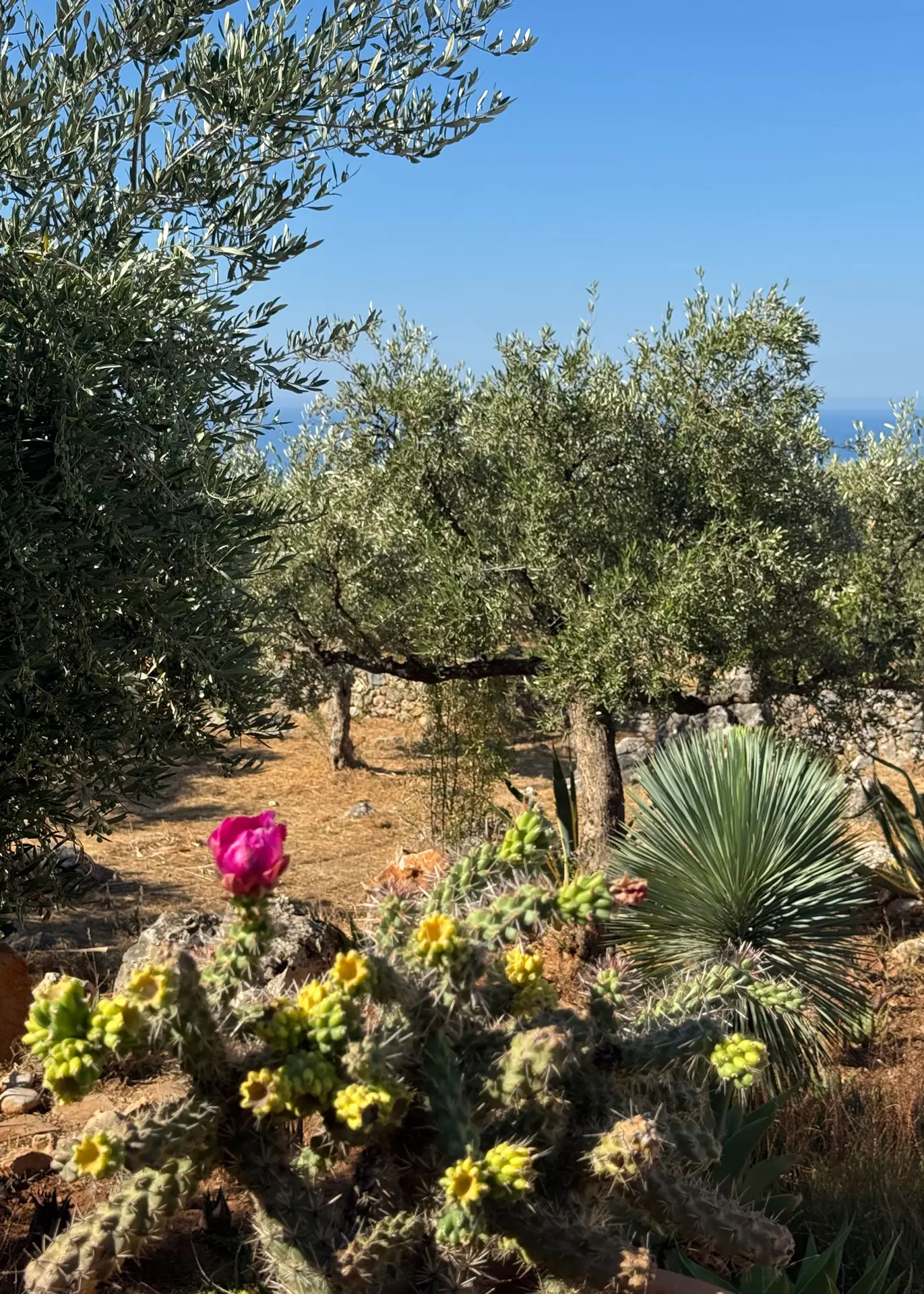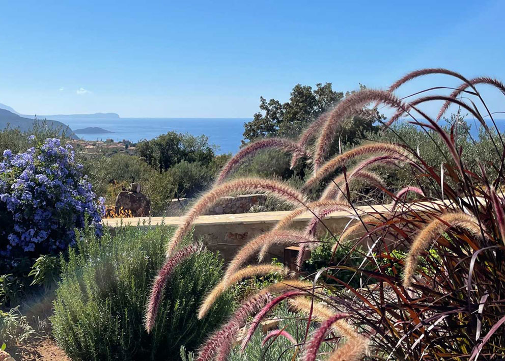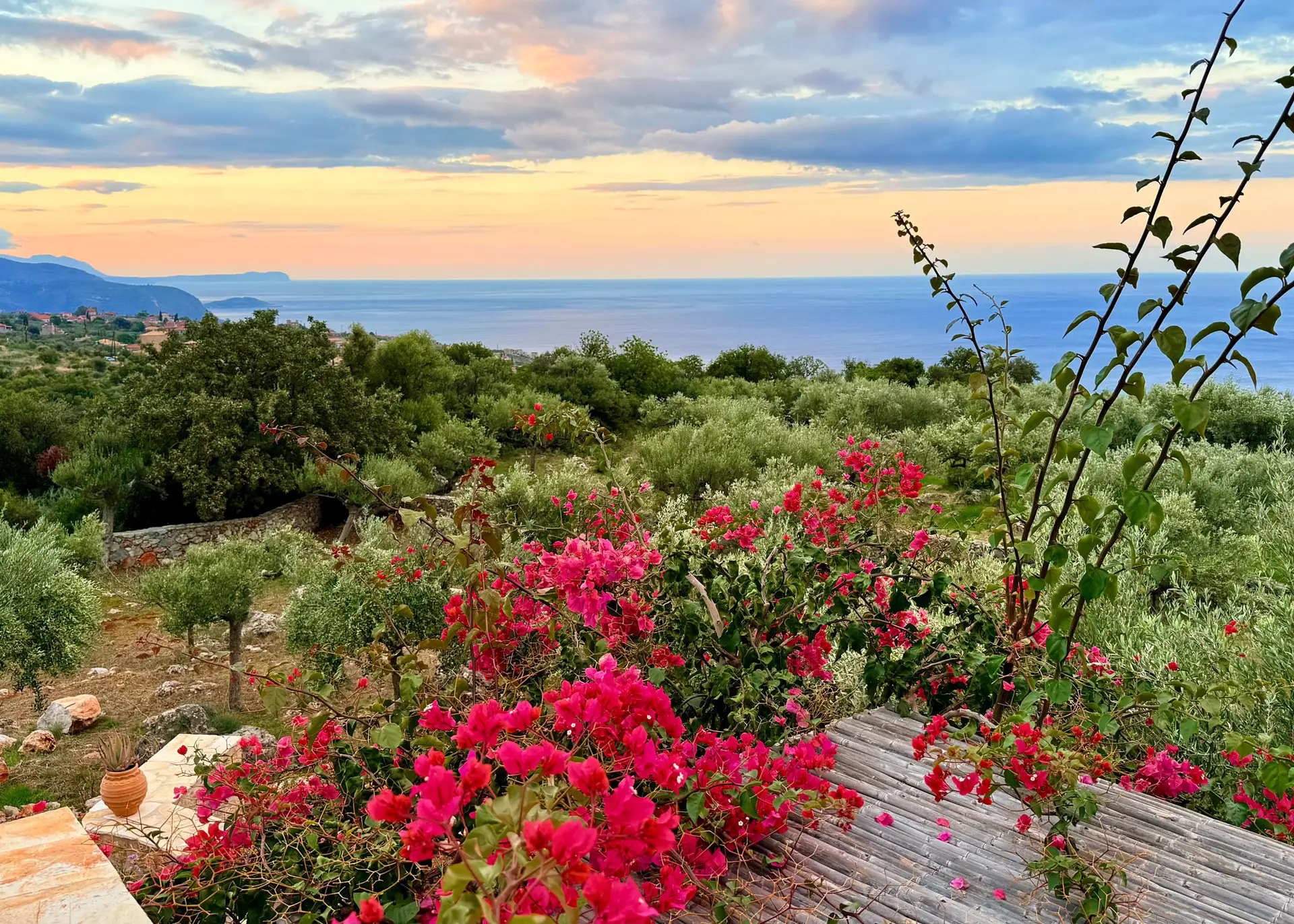 Logo von The Mulberry, ein Ferienhaus in Griechenland, Mani. Es zeigt einen stlisierten Maulbeerzweig und den Schriftzug 'The Mulberry, Mani Greece'.