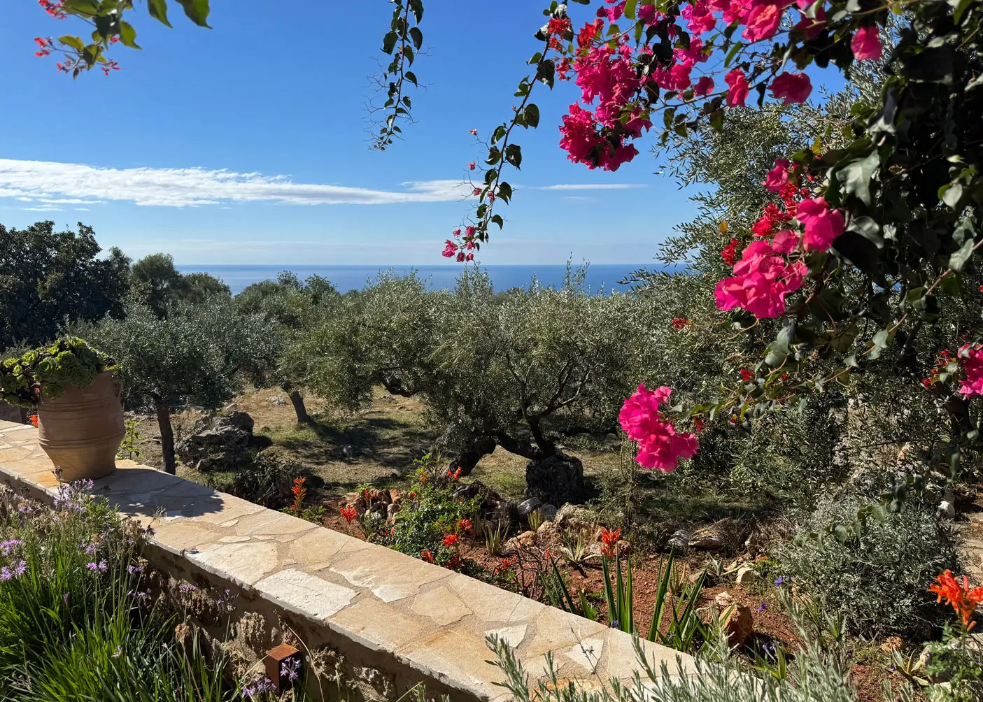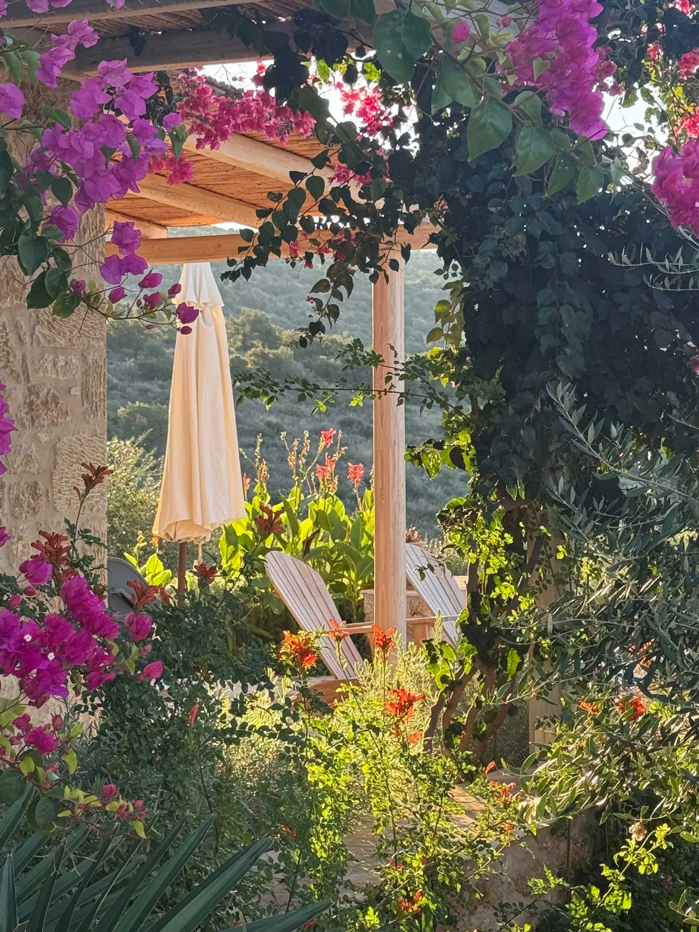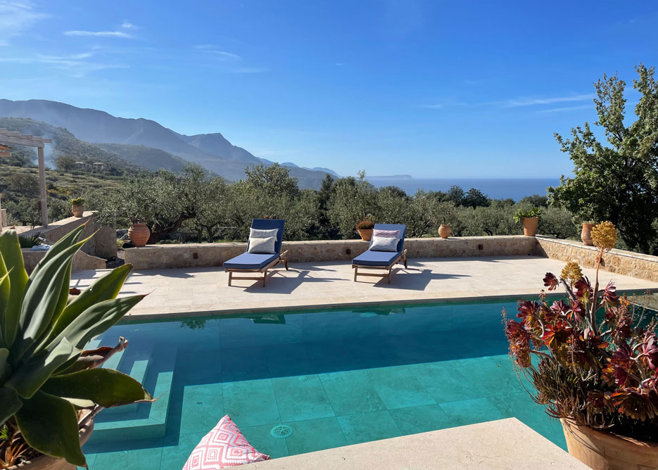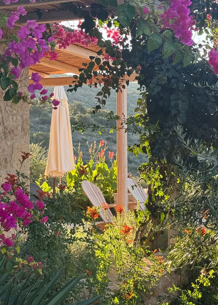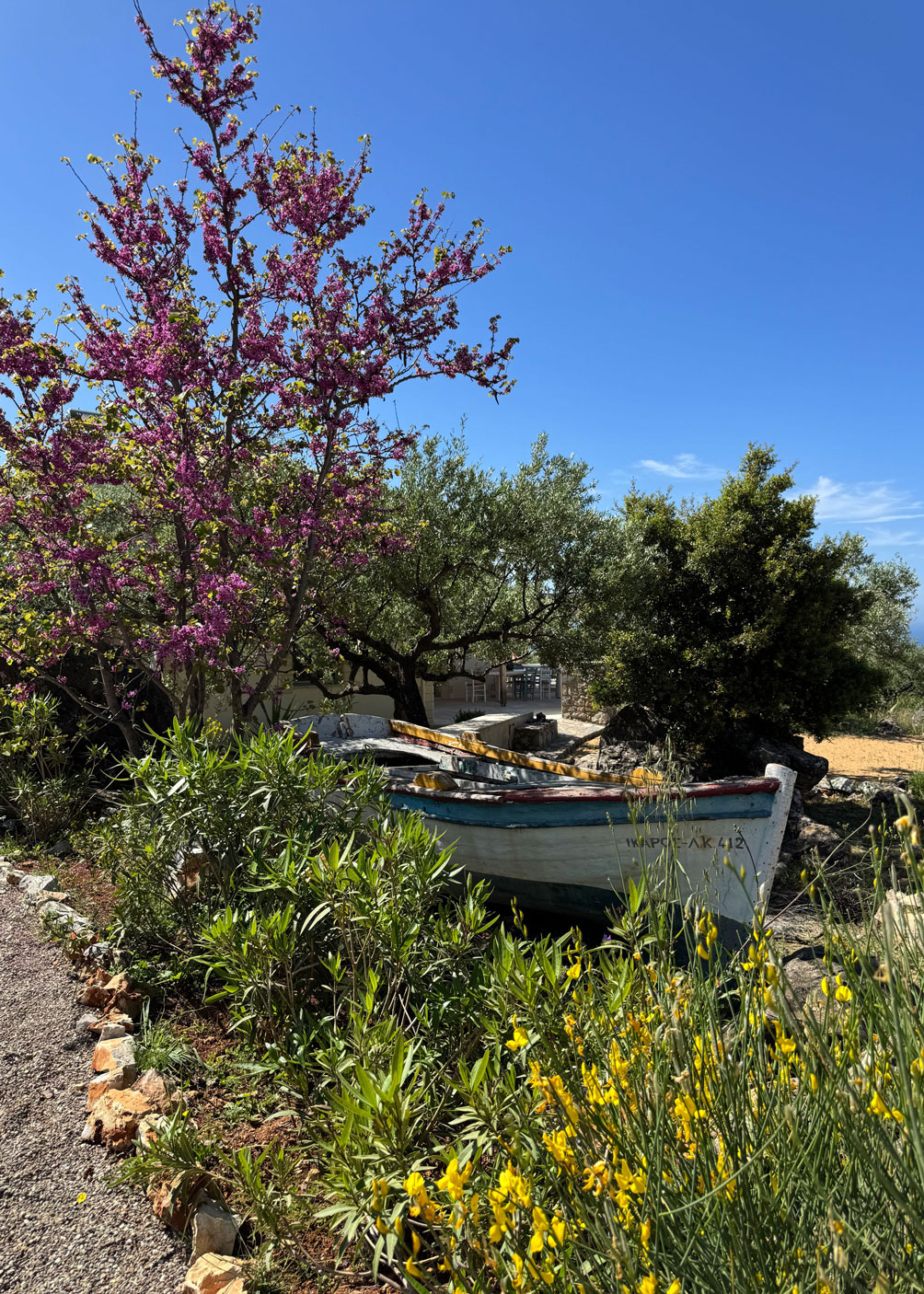 Logo von The Mulberry, ein Ferienhaus in Griechenland, Mani. Es zeigt einen stlisierten Maulbeerzweig und den Schriftzug 'The Mulberry, Mani Greece'.