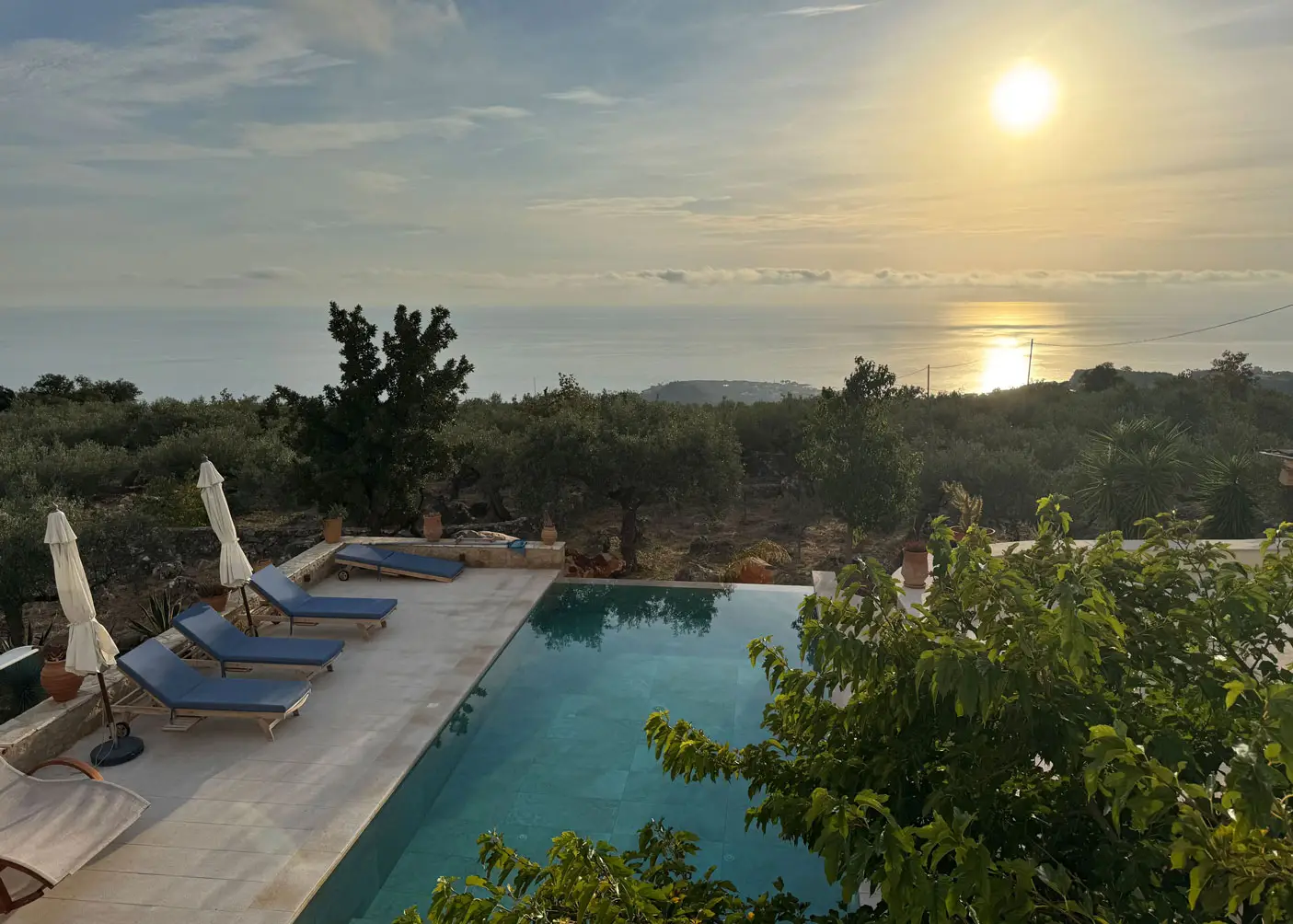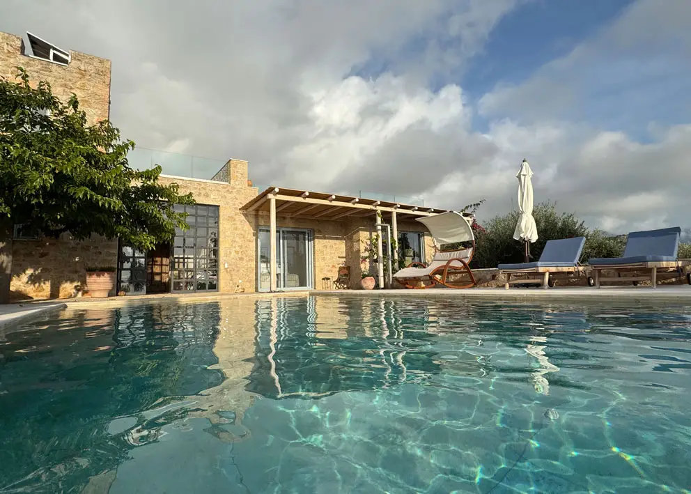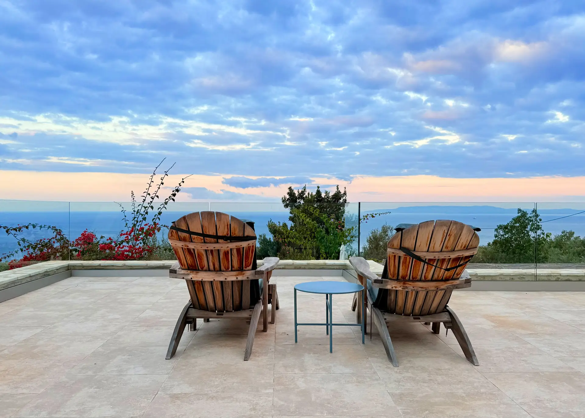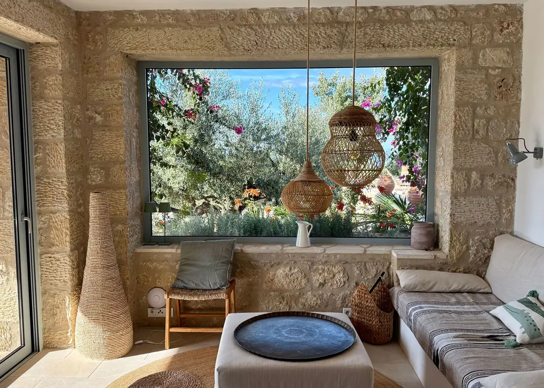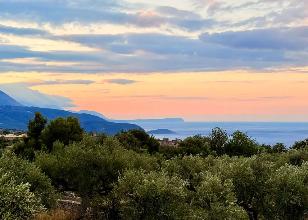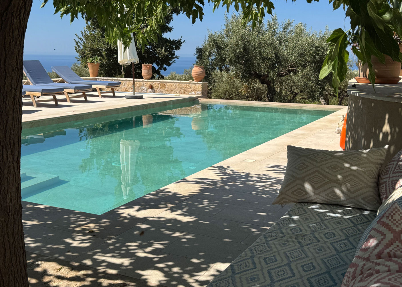 Logo von The Mulberry, ein Ferienhaus in Griechenland, Mani. Es zeigt einen stlisierten Maulbeerzweig und den Schriftzug 'The Mulberry, Mani Greece'.